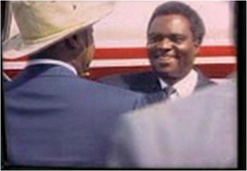 Marching on the red carpet with Yoweri Museveni to avoid the crisis. Habyarimana's helicopter was shot by a surface to air misile before landing at the airport.