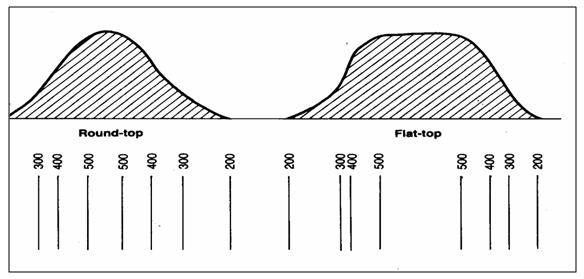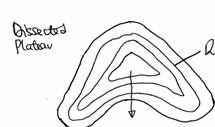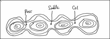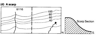 8. State the major relief features for example conical hill, flat topped hill, dissected plateau, ridges with saddles and cols, escarpments, valleys, spurs, basins etc. All are shown in the diagrams below.