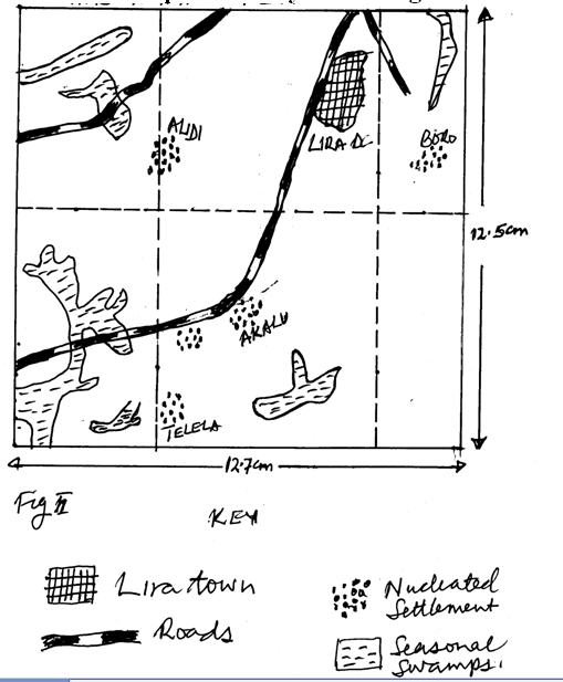 The reduced map of Lira by 3 showing seasonal swamps and human features