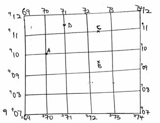 The position of any place on a map is given by the point at which two lines at right angles to one another meet. For example the value of A on the above diagram can be as follows: