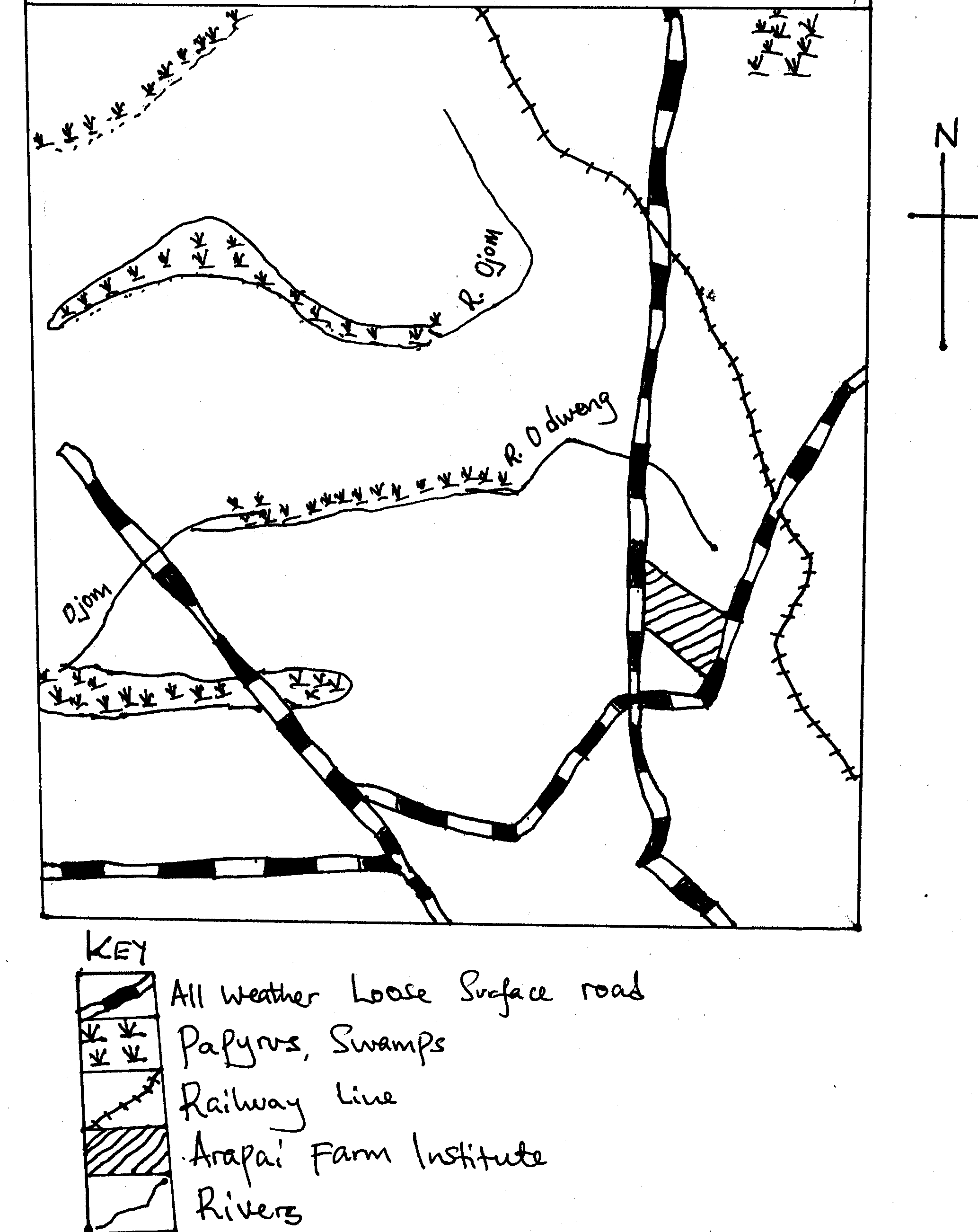 d) A sketch map of Arapai showing farm institute, railway line all weather loose surface road, papyrus swamp and rivers