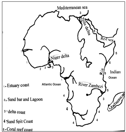 The term coast is used to denote the zone of contact between the land and the sea. African coastline is about 27000 km only. It is shorter compared to Europe’s.