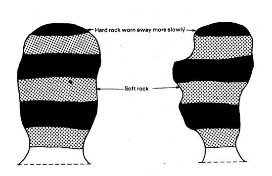 These processes undercut and wear away the weaker rocks faster than the hard ones. Examples are Mukarob, Asb and finger of God in Namibia, "Devils Rock" of Agade in Niger.