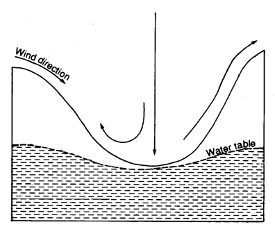 Saltation refers to the bouncing action of particles along the surface. Loose sand grains are transported in this way over long distances.