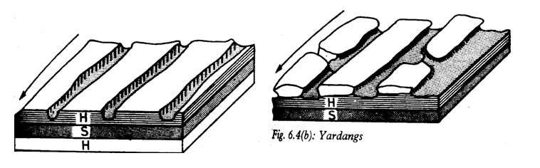 These are made of deep furrows and elongated ridges running parallel. Defined as parallel harder rocks standing out when the softer rocks are eroded away. When the wind blows parallel to the rock layers, the harder rocks become resistant and are left standing up. Clear examples are seen at the following areas: - Nile Valley North of Aswan, At Rebir and Filf in Egypt, Borko at Omuniaga in Chad.