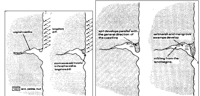 A bay or an inlet at the coast may be subjected to deposition by the incoming silts and sands from the interior brought by the rivers.