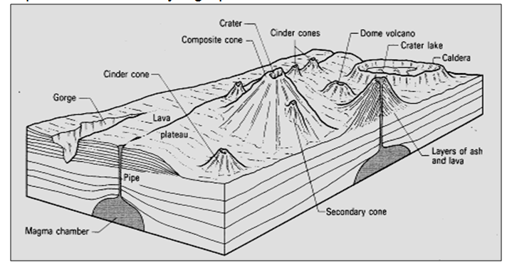 When the magma reaches the surface, features formed are called extrusive volcanic features and they include the following; Volcanoes, Volcanic Plugs, Lava Plateau, Caldera, Crater, Hot Springs, Ash and Cinder cones.